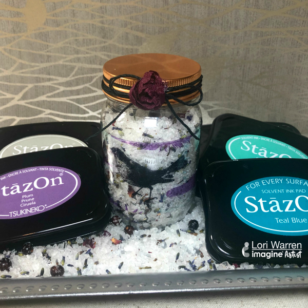 As the leaves turn color, they not only mark the return of Fall, they also mark the time for crafters to start their Holiday makes or gifts. One of my makes this year is a hand-stamped jar to fill with home-made bath salts. Stamping on such a curved surface can be a difficult task. One way to turn this challenging task into an easy one is to use StazOn ink to stamp on Window Cling Vinyl, it makes decorating a jar with a hand-stamped image, a breeze!