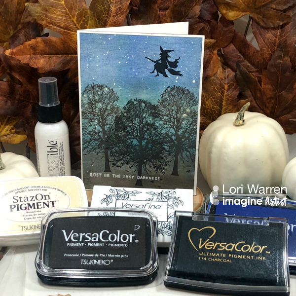 Happy Halloween! Today, I will create an ink blended backgrounds with a brayer and blue, brown, and teal colors of VersaColor pigment ink for a Night Sky Halloween Flying Witch Card. It’s a quick and easy way to transform a piece of white cardstock into a blended night sky. I stamp bare tree silhouettes in the foreground to give this design the look of a fall landscape. Another optional step is to flick some white acrylic
