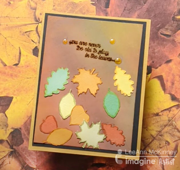 I then stamp out my sentiment and used On Point Glue to adhere falling leaves. I applied three dots of Gold Pico Embellishment to complete this project. I only use Kromekote Glossy Cardstock for this technique and it comes out perfect every time.