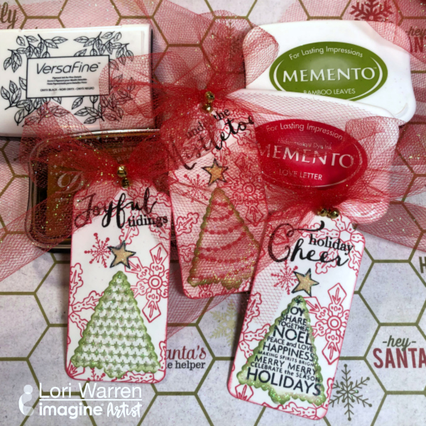 Create a trio of fancy tags that will brighten the top of any Christmas gift or package. A few randomly stamped red snowflake images onto a tag create the perfect backdrop for a Holiday tree focal point. Then, finish each tag with a sentiment such as “under the mistletoe” or “holiday cheers,” a bit of glitter, a golden star, and a Tulle ribbon bow. Instant joy for this package upgrade!
