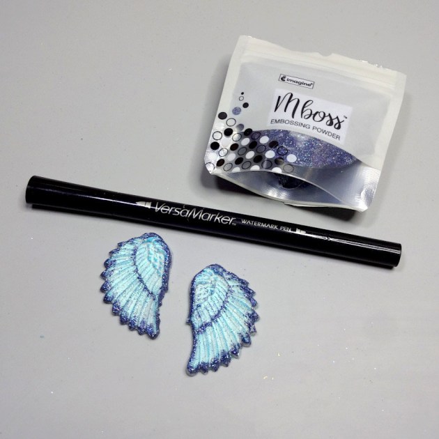 Use your VersaMarker to mark around the wings and in the middle. Cover with Mboss embossing powder and heat set. The Creative MEDIUM will get soft with the heat at this point, but it will not affect the end result.