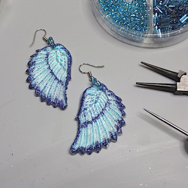 Pinch a small hole to the top of the wings, add a jump ring with some beads and finish with the earring hook.