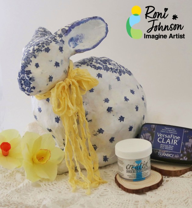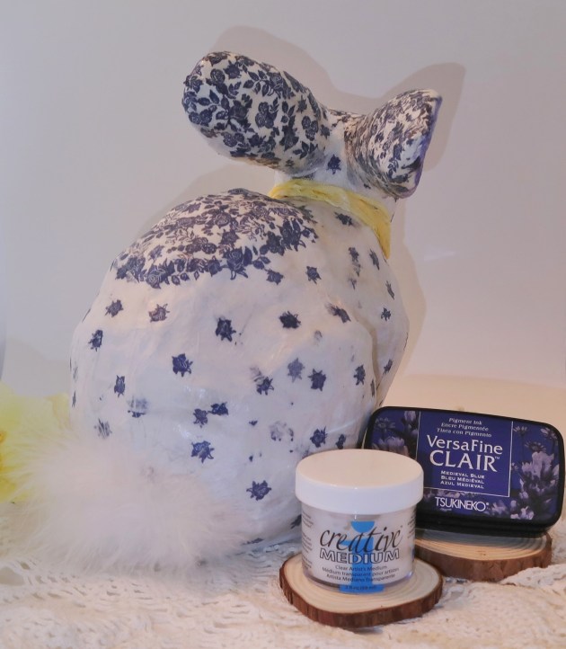 Gather up your supplies, you will need a paper mache animal – I choose a rabbit for Spring, tissue paper, Medieval Blue VersaFine Clair ink and Creative Medium (Clear or Shimmer).
