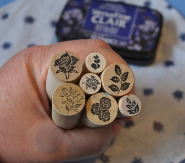 You will also need to gather a few small stamps. For this project I am using roses, leaves and vine peg stamps from Rubber Stamp Tapestry.