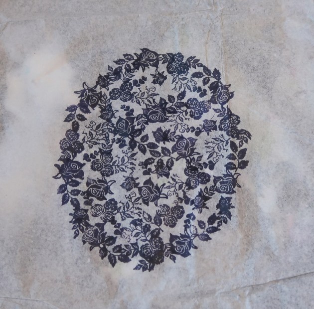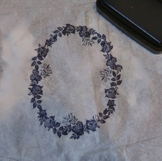 To create the concentrated stamped sections place a sheet of tissue paper over the desired area, in this case the back and trace the shape you wish to create. For this example I wanted a nice sized oval medallion over the back. You can see the faint pencil marking on the tissue paper in the photo.
