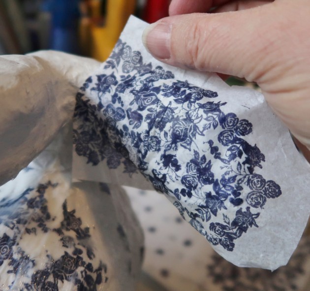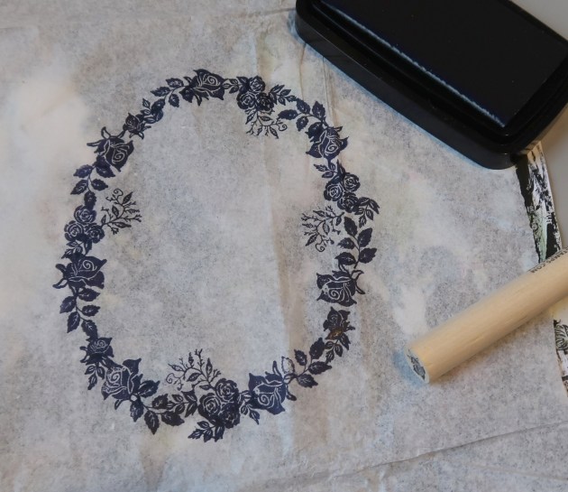 Step 12 – Stamp more tissue paper than you think you’ll need just in case. You don’t want to run out in the middle of covering the project and have to stop gluing to stamp more.
