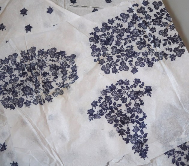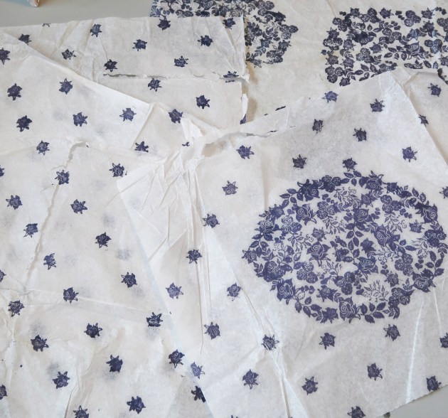 Step 11 – Stamp extra pieces of tissue paper with the diagonal 1” pattern to cover any areas which are not going to be covered with the concentrated pieces.