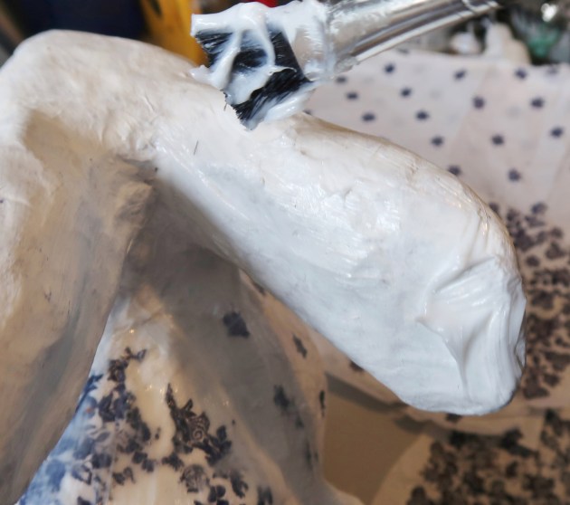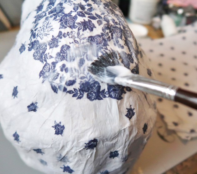 Step 14 – Pick up more Creative Medium on the paintbrush and gently dab the tissue paper and press it onto the paper mache form. Once in place cover the entire piece of tissue paper with a generous layer of Creative Medium.