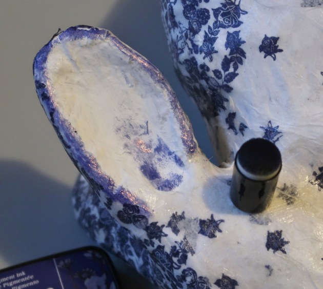This technique combines wide-open geometric stamped patterns with areas of saturation to give the piece defined areas to enhance and highlight certain areas of the animal. For this example, I used the more concentrated stamping on the face, ears and a medallion of sorts on its back. You will come to see how this turns a plain paper mache rabbit into a beautiful Blue Delft Bunny sure to please.