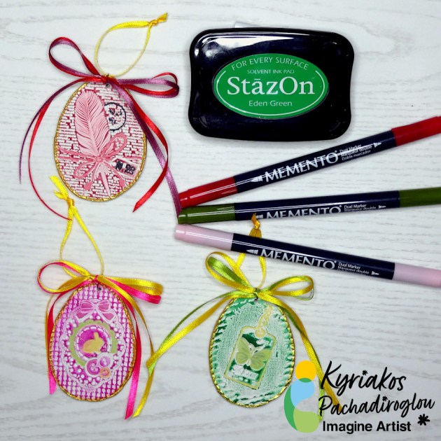 Stamp Easter egg designs on clay and color them with StazOn inks and Memento Dual Tip Markers to make Easter ornaments. Decorate tree branches in a vase for a Spring and Easter theme or add them to gift packages and bags.