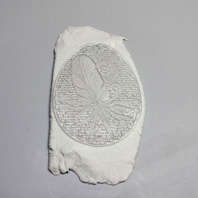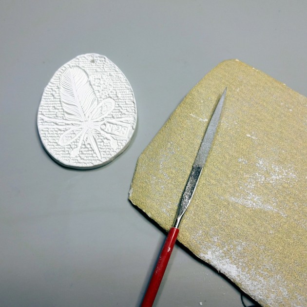 Remove the stamp and cut around the design with a pointed tool (a pallet knife, a piercing tool, etc). Don’t forget to open a hole on the top of the shape. Let the clay cure.