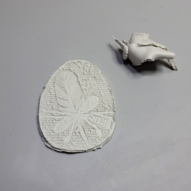 On a flat piece of clay, press the egg design stamp.