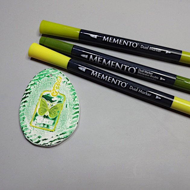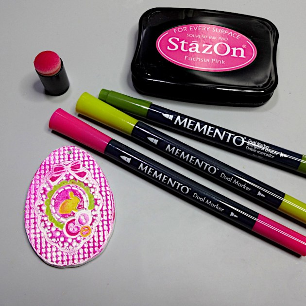 Finally, use StazOn Fuschia Pink and MEMENTO Dual Tip Markers Pear Tart, Rose Bud and Bamboo Leaves to color the clay egg.