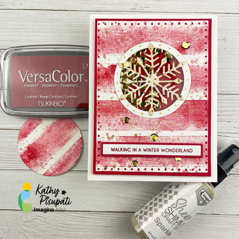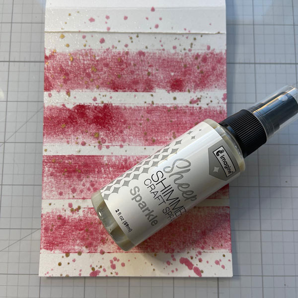 Next I smushed some of the Cardinal ink on my glass mat, added water and with a paint brush I splattered the panel. I did the same with some gold water color paint. Finally, I spritzed the Sheer Shimmer Craft Spray in Sparkle all over the panel. Can you see the shimmer? It is pretty!