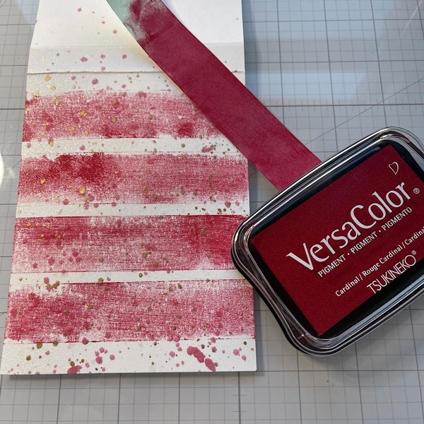 You will need a top-folding card base measuring 4 1/4 x 5 1/2“. You will also need another white panel measuring 3.75” x 5”. Grab your masking tape and a VersaColor ink. I used Cardinal. At this point you can put on some gloves if you want but I didn’t. I swiped the ink across a 5”piece of tap. I then laid the tape across the white card stock panel, put a piece of copy paper over it and pressed. I repeated this stripe 4 times. I like the texture of the stripe.