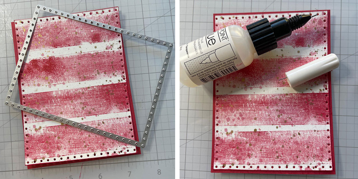 Next, I cut the panel with a die and added a piece of red stock to the back. The red card stock is 1/4’’ larger than the striped panel. Adhere with some On Point liquid glue.
