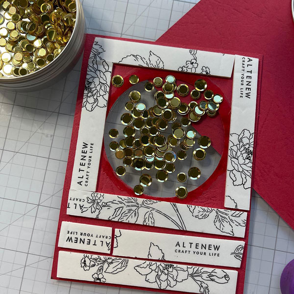 Cut a slightly larger circle from acetate or old packing and glue to the back of the main panel. Add foam tape all around and add flat embellishments to the center. I used gold confetti from Kat Scrappiness.