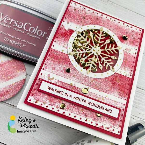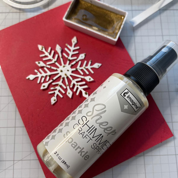 Die-cut a few of the medium sized snowflakes from the Kat Scrappiness Snowflake Trio and glue together. Then I used the Sheer Shimmer Craft Spray and spritzed the snowflake. I also splattered it with gold water color paint. It was still a bit too white so I pressed the snowflake into my Delicata Golden Glitz ink pad.