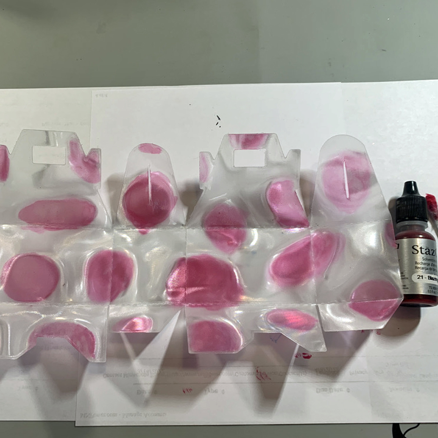 Place a few drops ink from StazOn Blazing Red inker on a plastic surface to use as a palette.