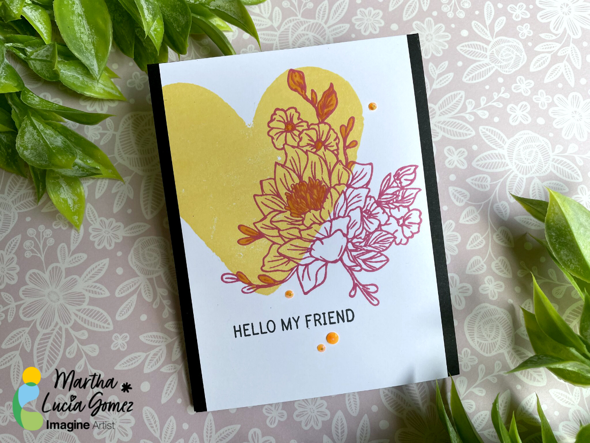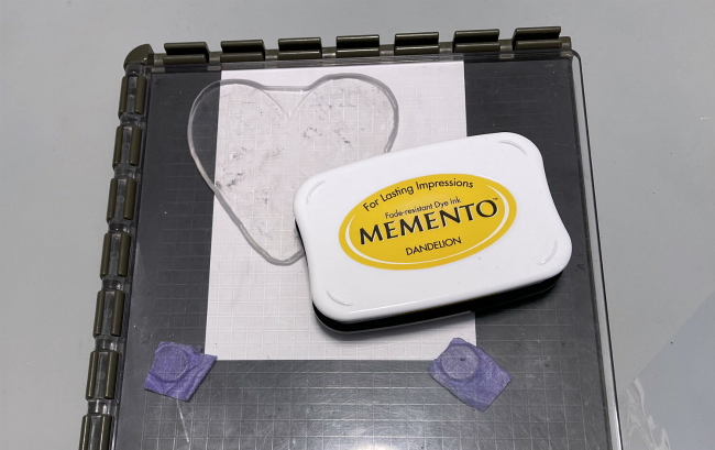 Take a piece of white smooth cardstock and ink well your solid stamp with Memento Ink. In my sample, I am using the Dandelion color. If you want you can use a stamping tool to have a better result or obtain a crispy image.