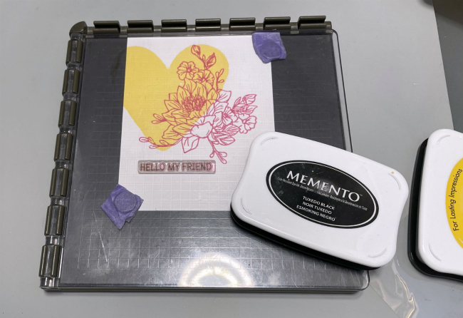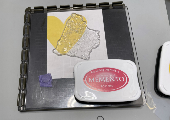 Select a lineal stamp and place it covering partially the image previously stamped. You can use a different color of Memento Ink to create a contrast. I am using the Rose Bud Memento Ink.