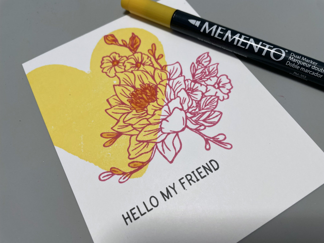 To enhance special details of your stamped image you can use Memento Markers. I used the same Dandelion color just in a small spaces on the floral image to enhance the details.