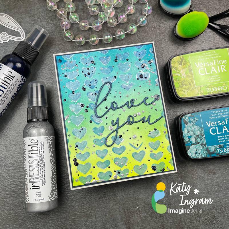 In today’s video tutorial I do some ink blending with VersaFine Clair Verdant and Warm Breeze. I haven’t used these two colors for ink blending before and they blended really well and the colors coordinate perfectly together. I used a heart stencil with VersaFine Clair Paradise to blend over the ink blended panel and then added some Sheer Shimmer Stix in Frost for a bit of shimmer. I also pulled out some irRESISTible Spray in Paris Dusk and Silver to create some splatter. I finished the panel off by die cutting the words love and you with some metallic blue cardstock. Check out the video to see the process in action. I hope you enjoy and thanks for stopping by.