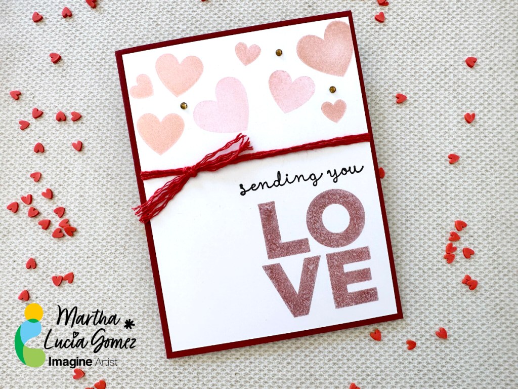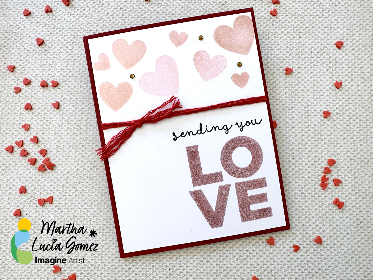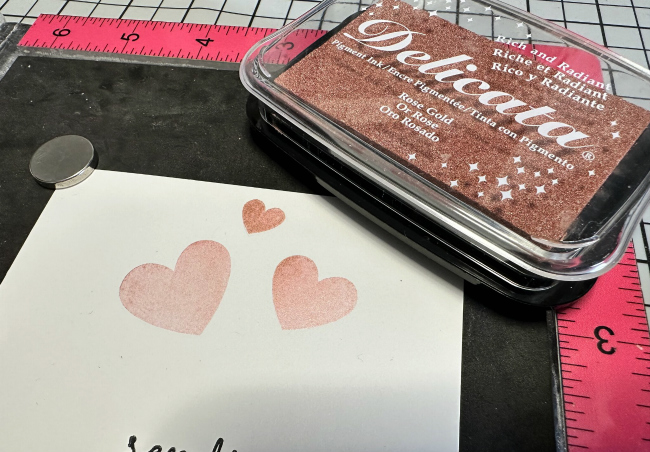 Now is the time to create more texture. This time, I used Rose Gold Delicata Ink to create it and hearts in different sizes. I stamped them randomly on the upper part of the card. Using a stamping tool, you can create different tones with the same ink and color, depending of the times that you stamp your image.