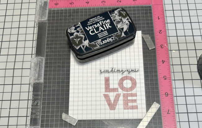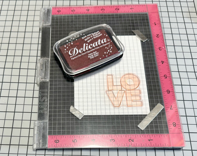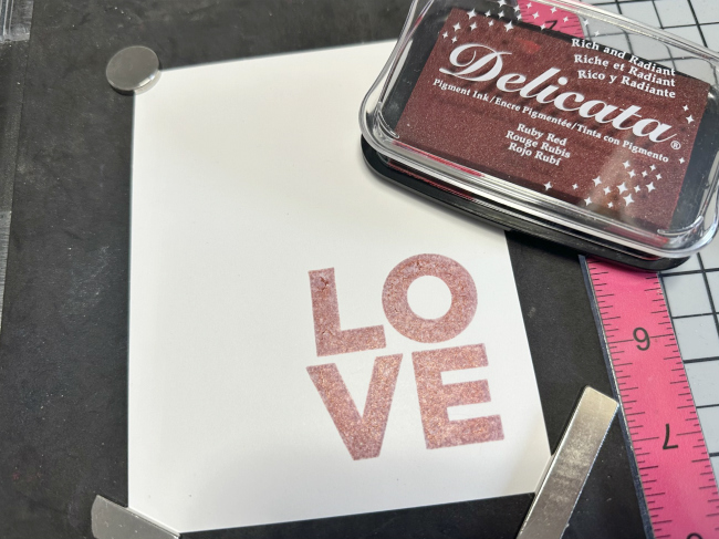 Take a piece of white smooth cardstock and solid stamps to create your design. In my sample, I am using hearts in different sizes and the Love Sentiment. First, ink the sentiment using the Ruby Red Delicata Ink. The Delicata is a pigment ink that dries within minutes on porous papers and never loses the luster. You can also obtain a Metallic touch with it if you don’t emboss the stamped images.