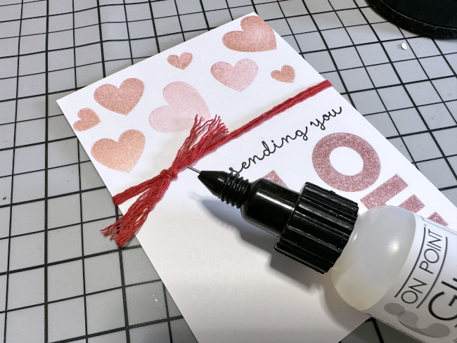 After finalizing the stamping process, I decided to embellish the card with a few loops of red twine. I used a dot of On Point Glue to secure just the knot.