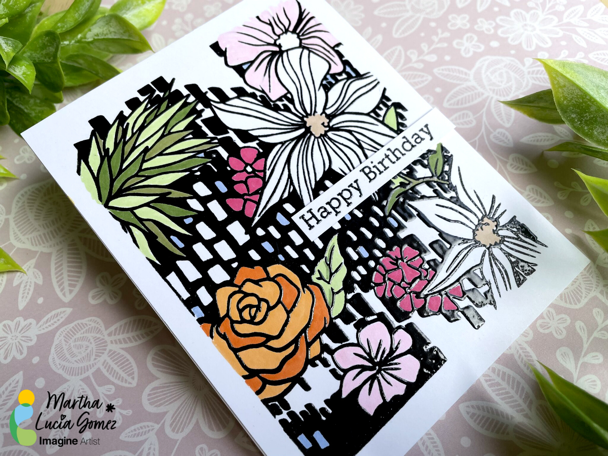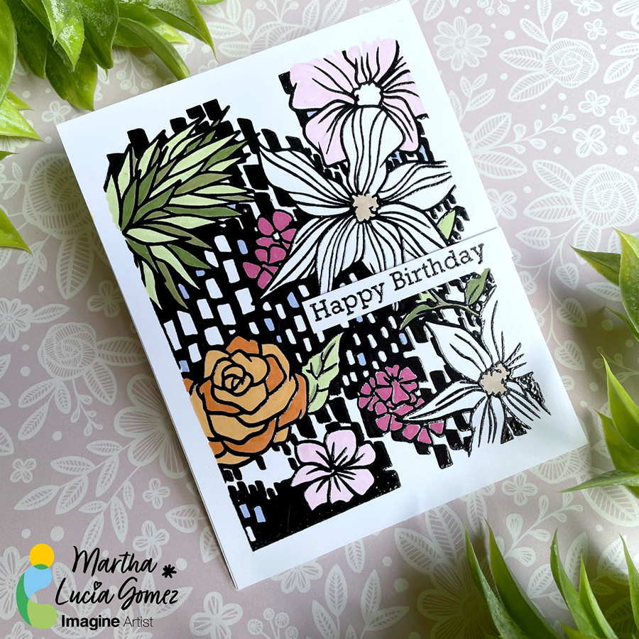 Hello there! Today’s tutorial is about a Birthday Card using a background stamp but adding texture and color. To make this, I used VersaFine Clair Nocturne, Clear Embossing Powder and Memento Markers.