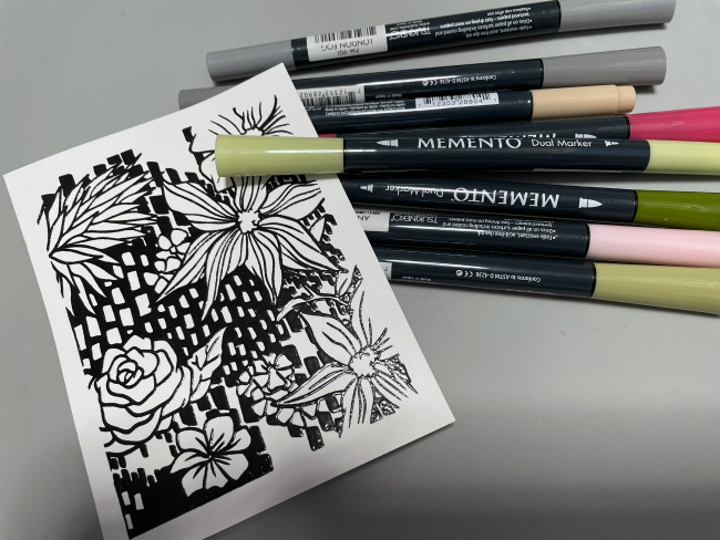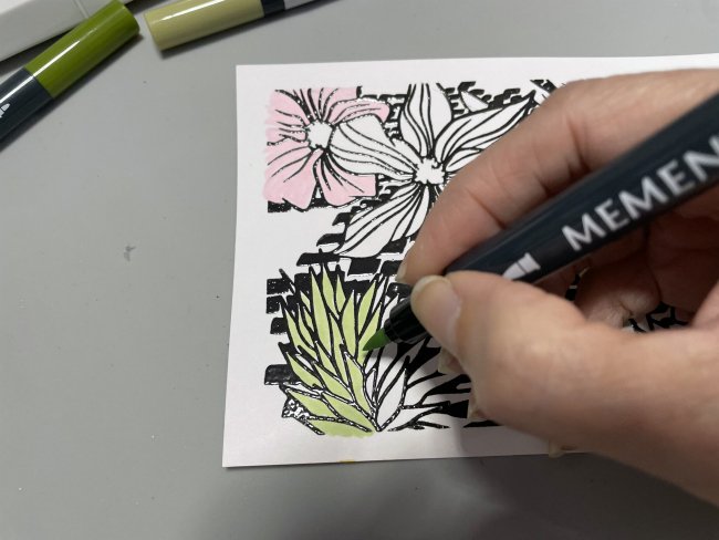To enhance the details of the stamp, color it partially with Memento Markers. The VersaFine Clair in is a safe ink to work with these Markers or with any type of Alcohol Markers.