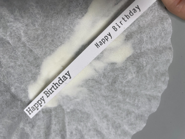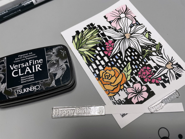 In a separate piece of white cardstock stamp the birthday sentiment using the same products used to create the background. I used VersaFine Clair Nocturne and Clear Embossing Powder.