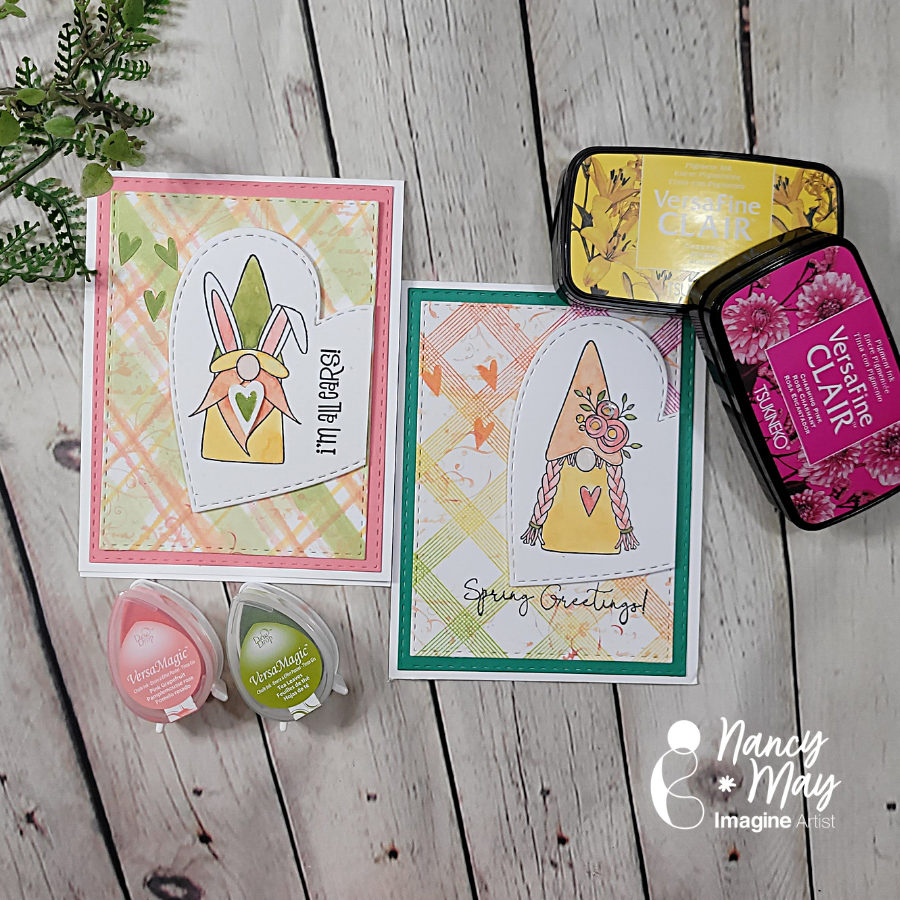 Hey y’all. We are going to make two very different fun, bright Spring plaid backgrounds. One is very controlled, precise, and clean, stamped in VersaFine Clair inks with a fun color gradient; the other is much looser and more organic, hand painted with VersaColor inks for a more painterly look.