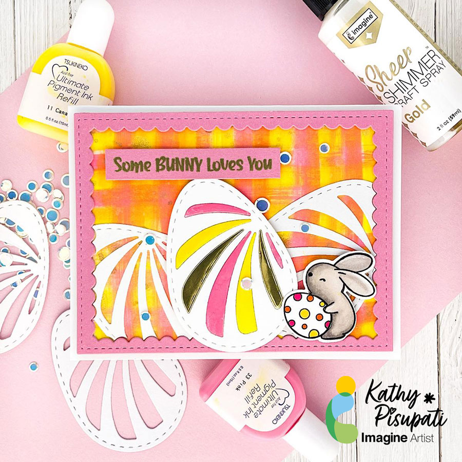 Good morning! Kathy here, creating art for Imagine Crafts! Today I have a new tutorial for you. Today’s project is an Easter card but it is also about creating your own backgrounds with Imagine Craft’s Ultimate Pigment Ink Refills! If you don’t have much patterned paper this is an easy background using the refills and baby wipes!