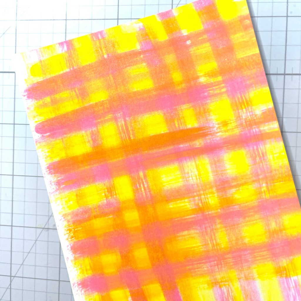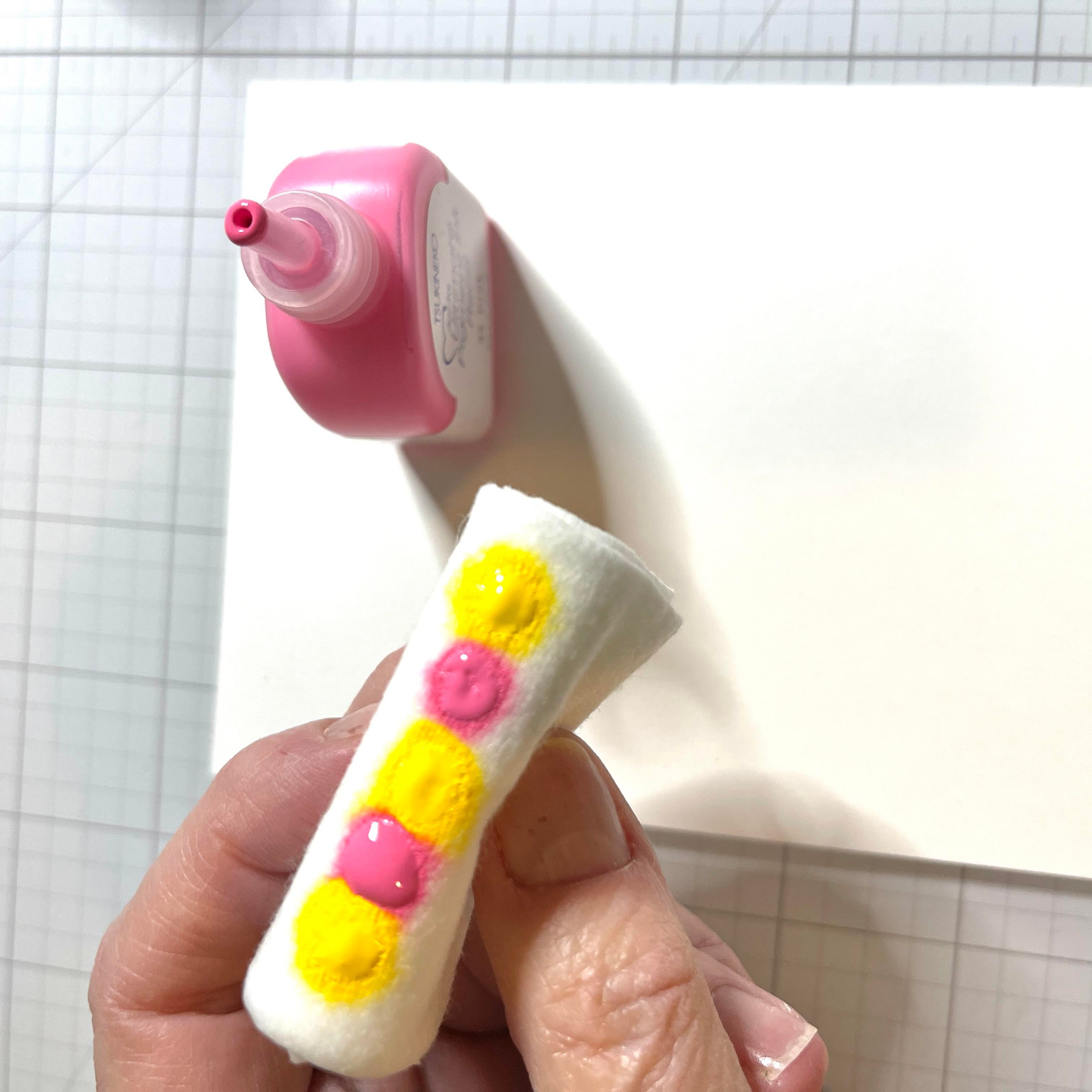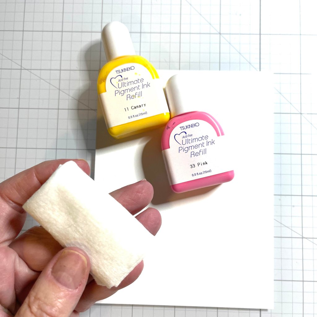 Cut a piece of a layering weight, white card stock to 4.25” x 5.5”. This will be enough for three holders. Grab your favorite ink refills. For today’s card I used Imagine Craft’s Ultimate Pigment Ink Refills in Canary and Pink. Grab a baby wipe and fold it up nicely.