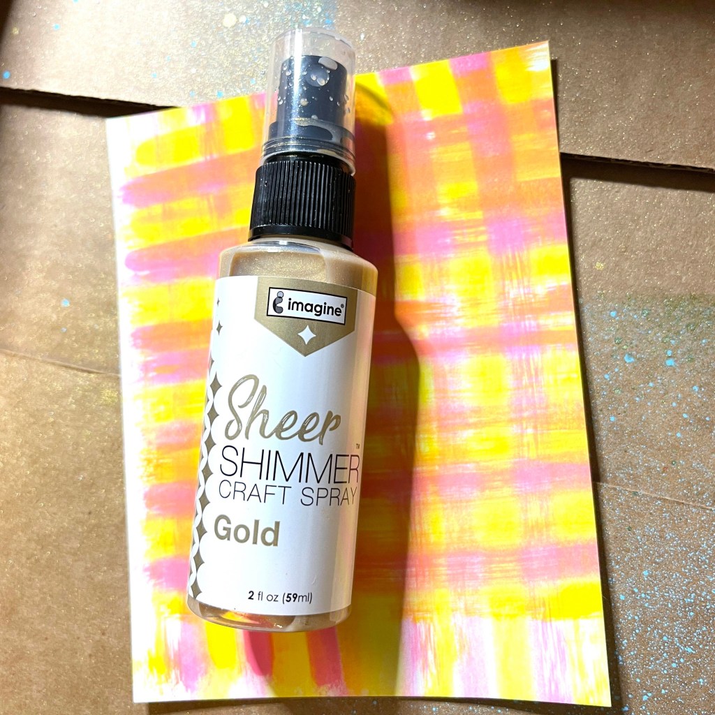 Time to get messy again! We will spray Sheer Shimmer Spray in Gold all over the panel. I use an old box and lay the panel inside. This contains the spray a bit. The sparkle of these sprays is so pretty and available in so many colors!