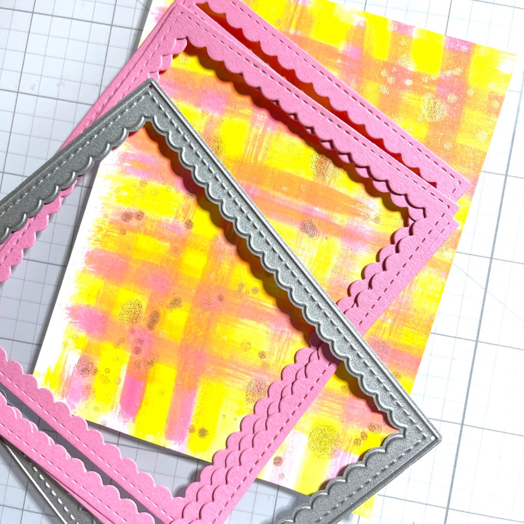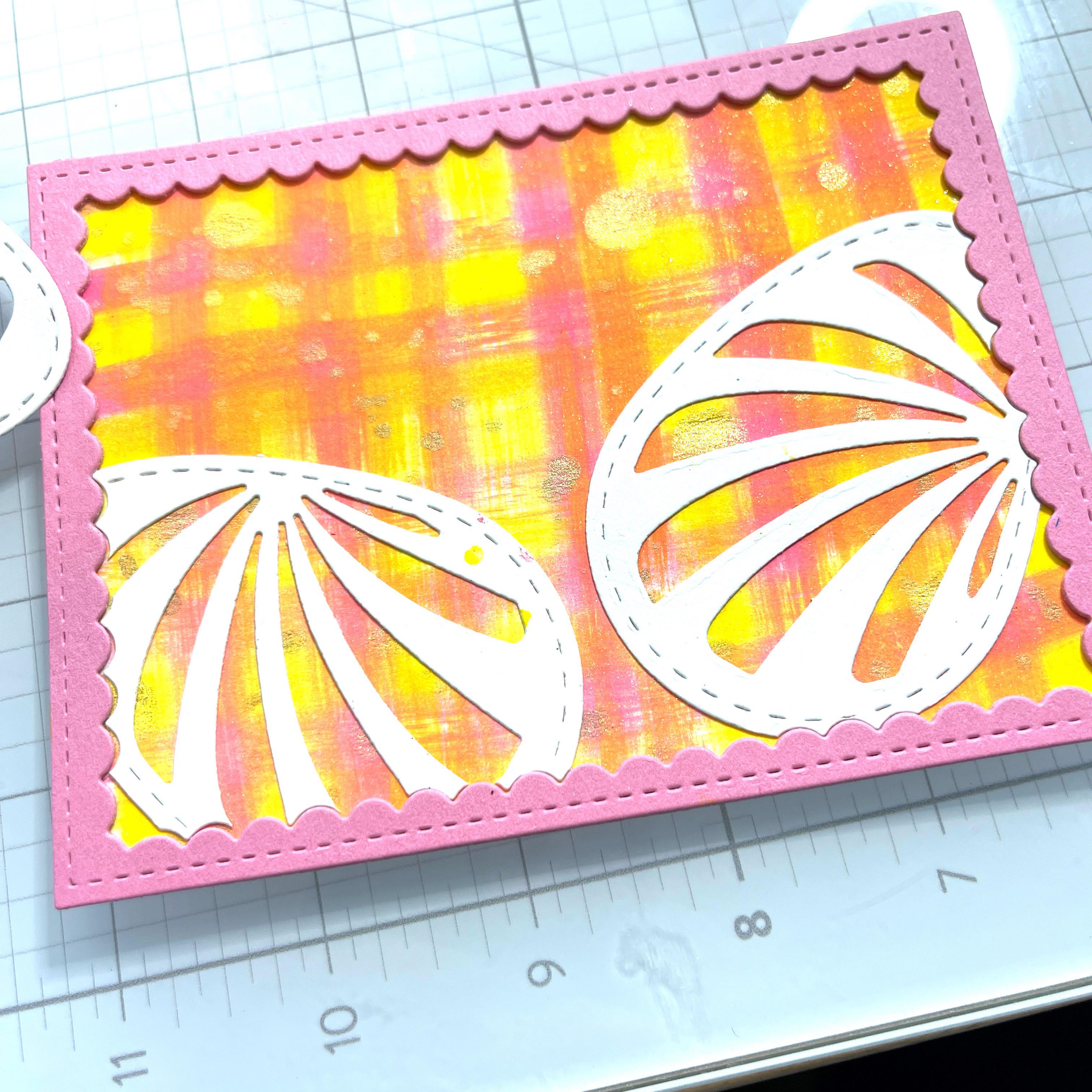 Next, I cut some scalloped frames and glued them together with On Point Glue. I used a coordinating pink card stock. Trim the background panel to fit behind the frame and adhere with On Point Glue from Imagine Crafts.