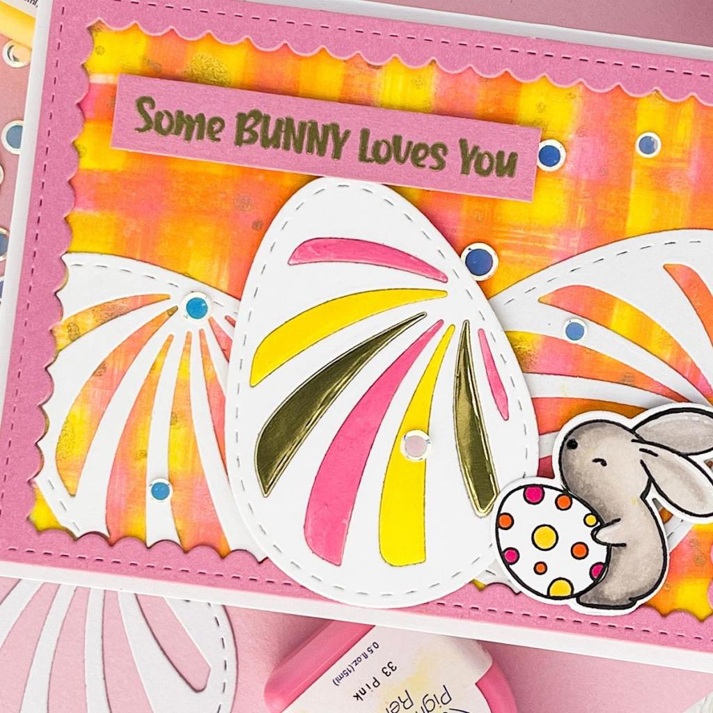 I traced the actual die and cut a solid egg out. I adhered this behind the main egg and adhered with glue. I took the insides of the die cut and just painted some of the pink and yellow refill ink on alternating stripes I also added 2 gold stripes from a metallic card stock.