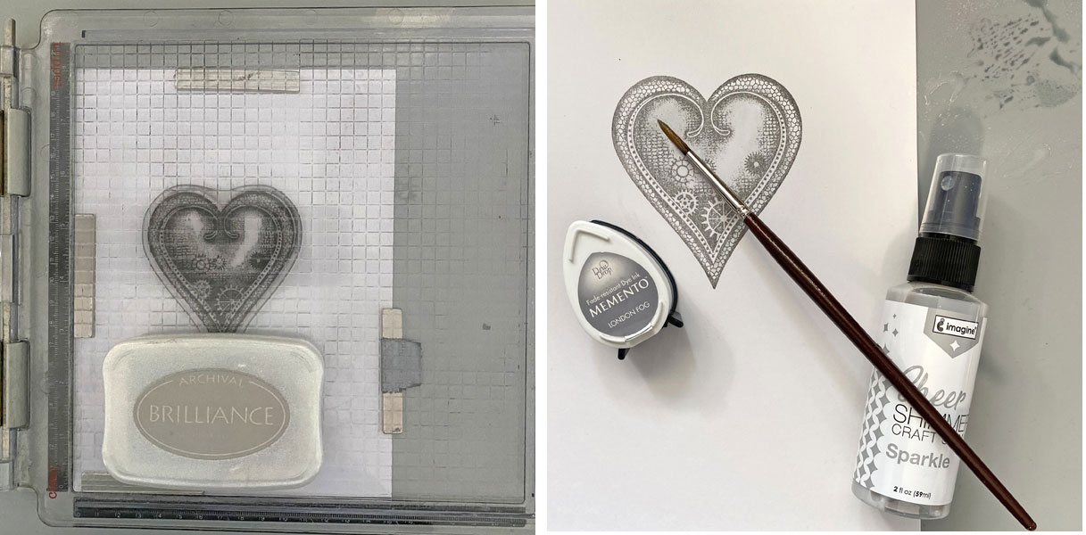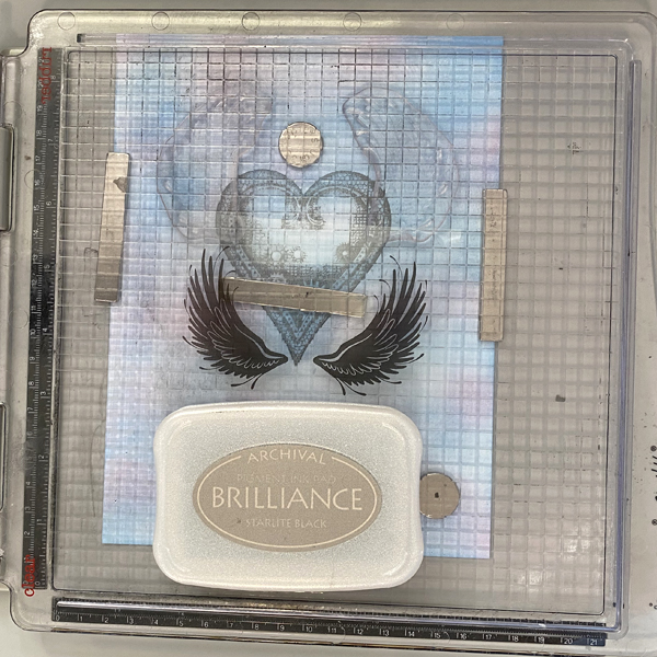 Use a stamping platform and Starlite Black Brilliance ink to stamp the Steampunk Heart twice – once onto a 6” x 8” piece of Mixed Media paper and a second time onto Repositionable Label paper. Heat set the Mixed Media paper panel.