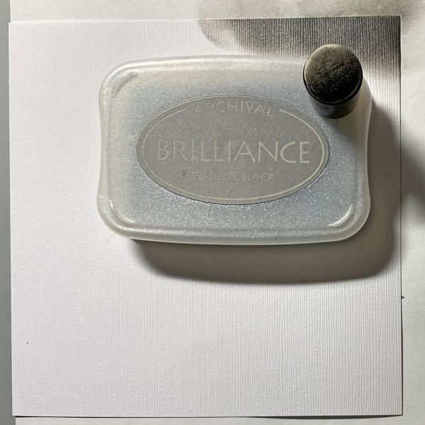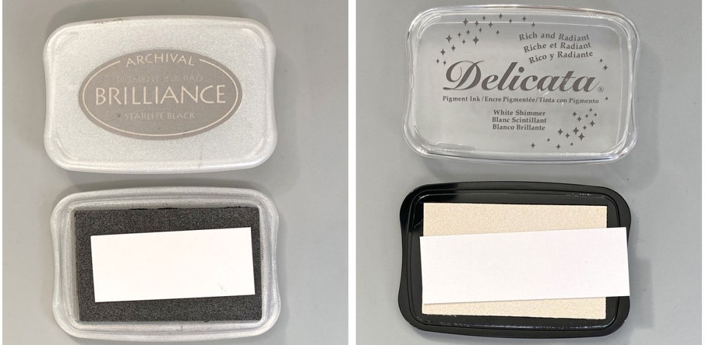 Smoosh a 1” wide strip of white cardstock onto the Starlite Black Brilliance Pad. Smoosh a second 2” wide strip of white cardstock onto the White Shimmer Delicata Ink Pad.