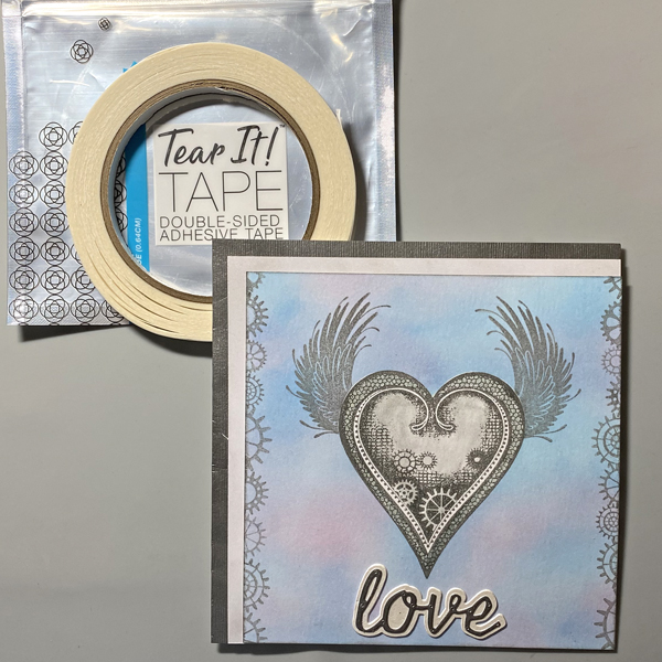 Use Tear It! Tape to adhere the shimmery white 5.75” square to the card.