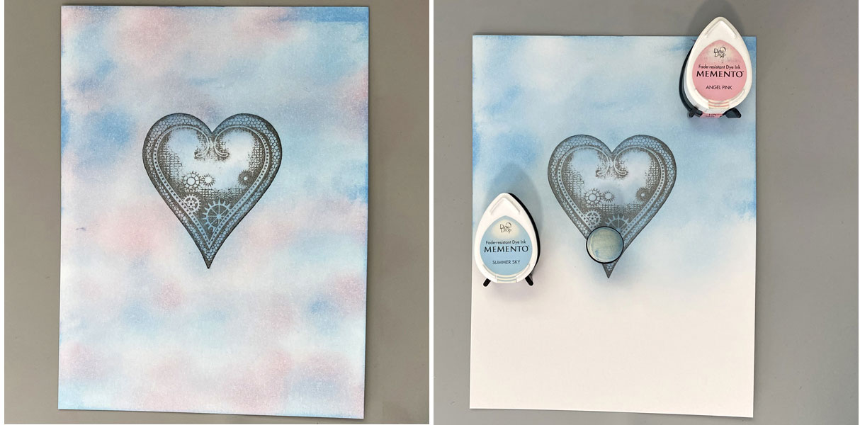 Use a Sponge Dauber to sponge Angel Pink Memento Ink onto the white areas of the image panel. You’ve now created a stormy sky!