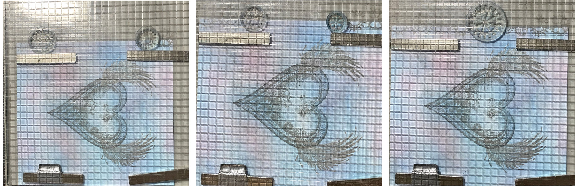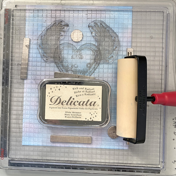 Use a brayer to apply White Shimmer Delicata Ink to the wing stamps. Stamp.
