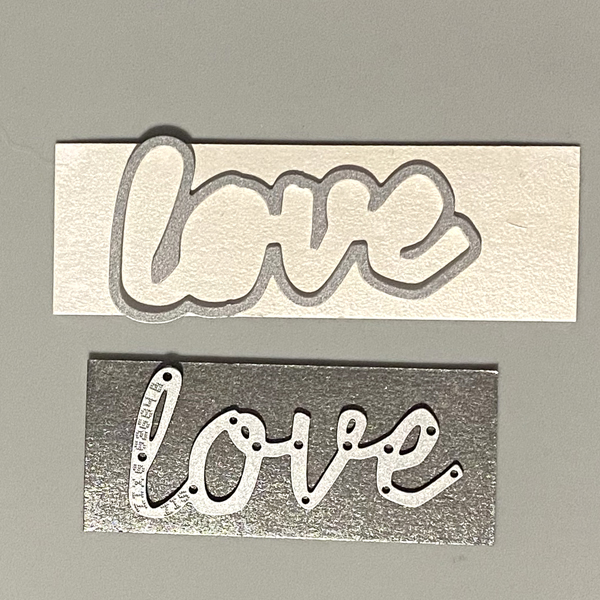 Use the “love” Shadow die to cut the White Shimmer Delicata inked cardstock.