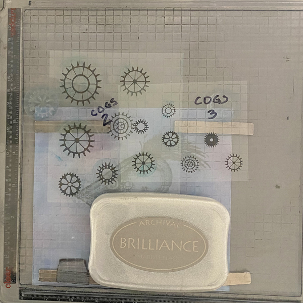 Position a large cog stamp facedown in the center of the cogs. Ink the stamp with Starlite Black Brilliance ink, stamp, and set. Remove and clean the cog stamps.