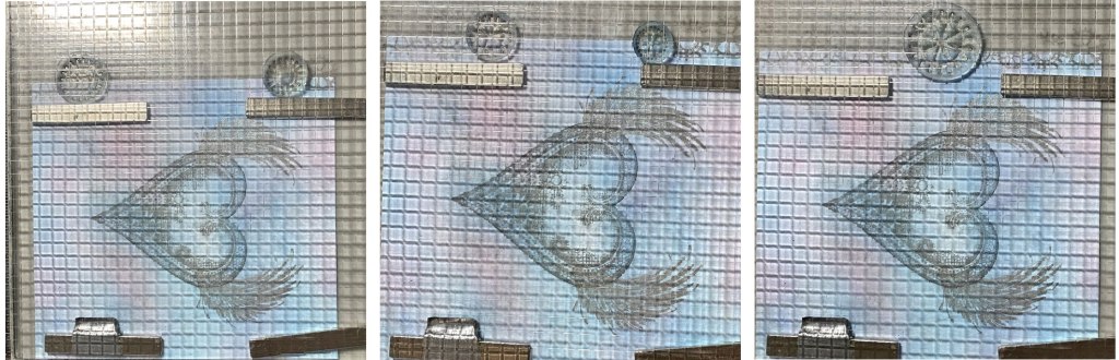 Use a stamping platform to position the wing stamps facedown on the masked steampunk heart.