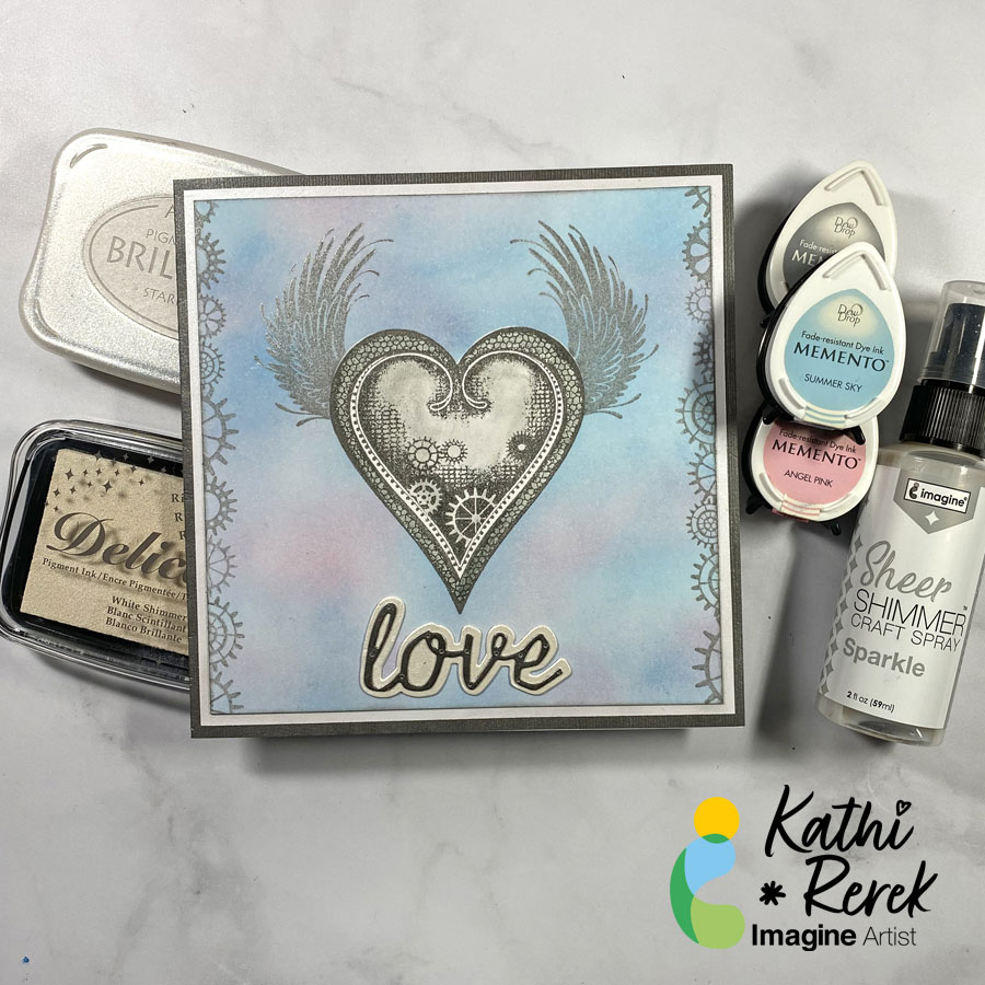 It’s Spring and love is in the air. Let’s combine the metallic look of Brilliance ink, the shimmer of Delicata Ink, pastel colors, and Steampunk imagery to create a Steampunk Love card.