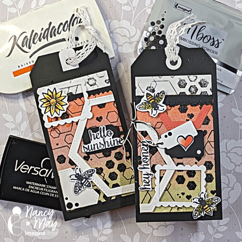 How familiar are you with Kaleidacolor inkpads and Mboss Embossing Powder? Let’s take a look at one of the Kaleidacolor pads I have had for many years and see how it does on the gel plate. Then we’ll play a bit and see how 4 different Mboss Embossing powders impact the same basic Gelli printed background.