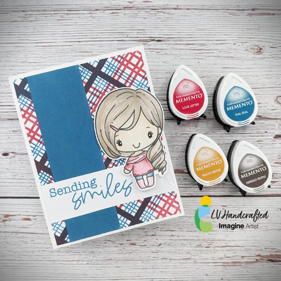 – Hello friends! This is Linh (or LV Handcrafted on all the socials). In today’s video I’m showing how to use your Memento Dew Drop inks to create a perfectly coordinated card. First, I created a background using Love Letter and Teal Zeal to create a plaid. I made a custom ink color by over-stamping multiple times with both colors!  I used Teal Zeal to create a coordinating solid color cardstock by just swiping it across white cardstock.  Finally, I smooshed Love Letter and Teal Zeal and used a waterbrush pen to color in my stamped image.  For the skin, I used Peanut Brittle and for the hair I used Espresso Truffle.